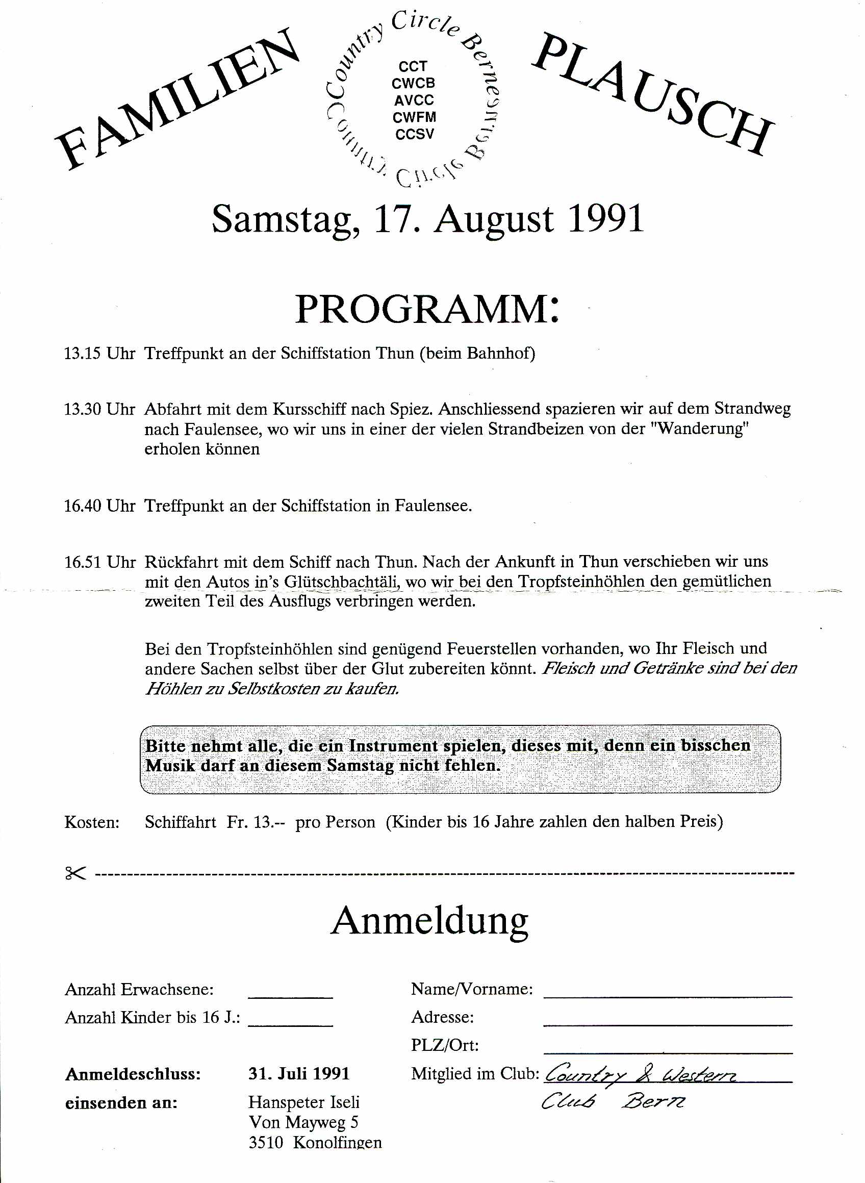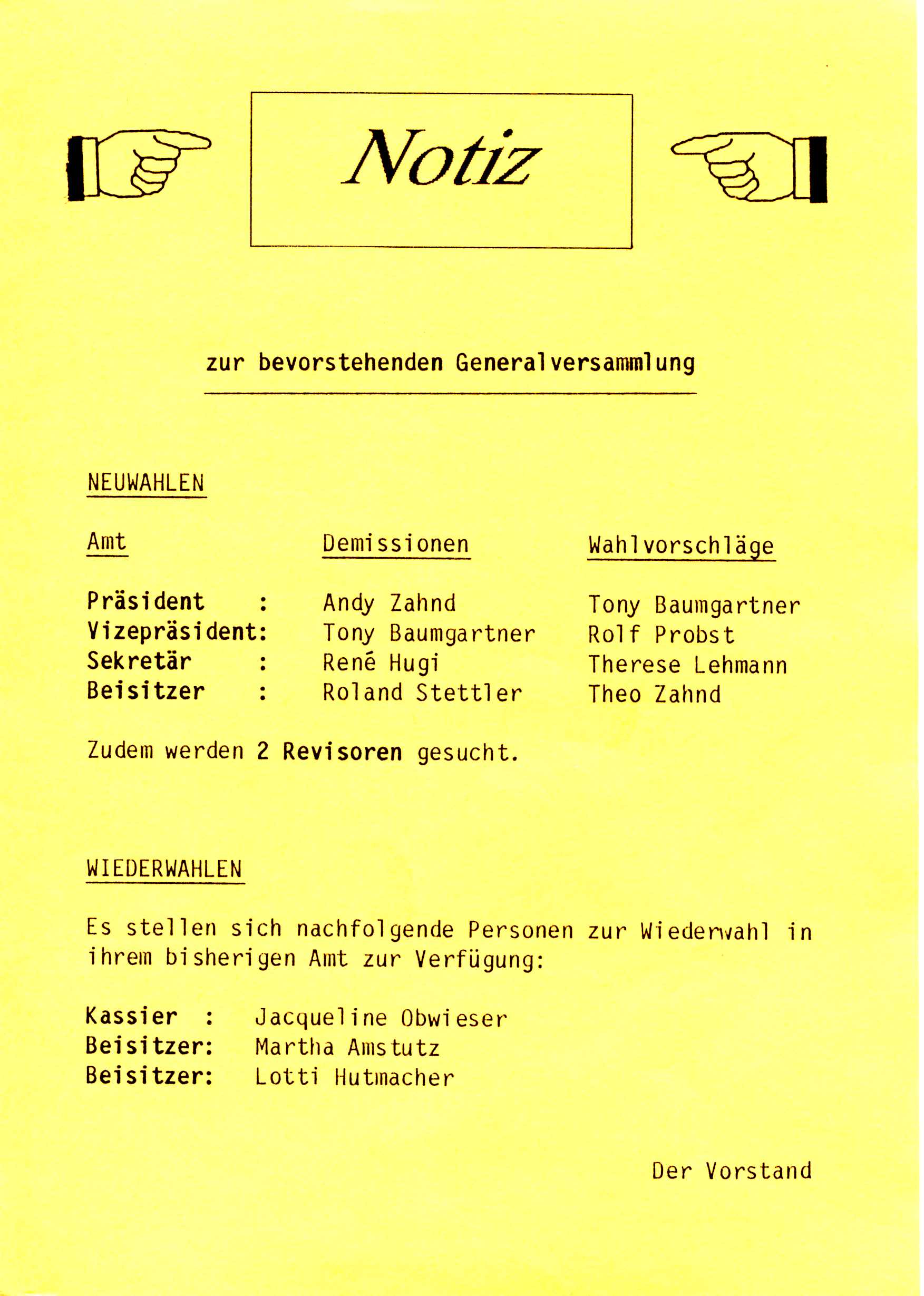 | Präsident: Tony Baumgartner Vize-Präsident: Rolf Probst Sekretär: Therese Lehmann Kassier: Jaqueline Obwieser Beisitzer: Lotti Hutmacher und Martha Amstutz Beisitzer: Theo Zahnd |