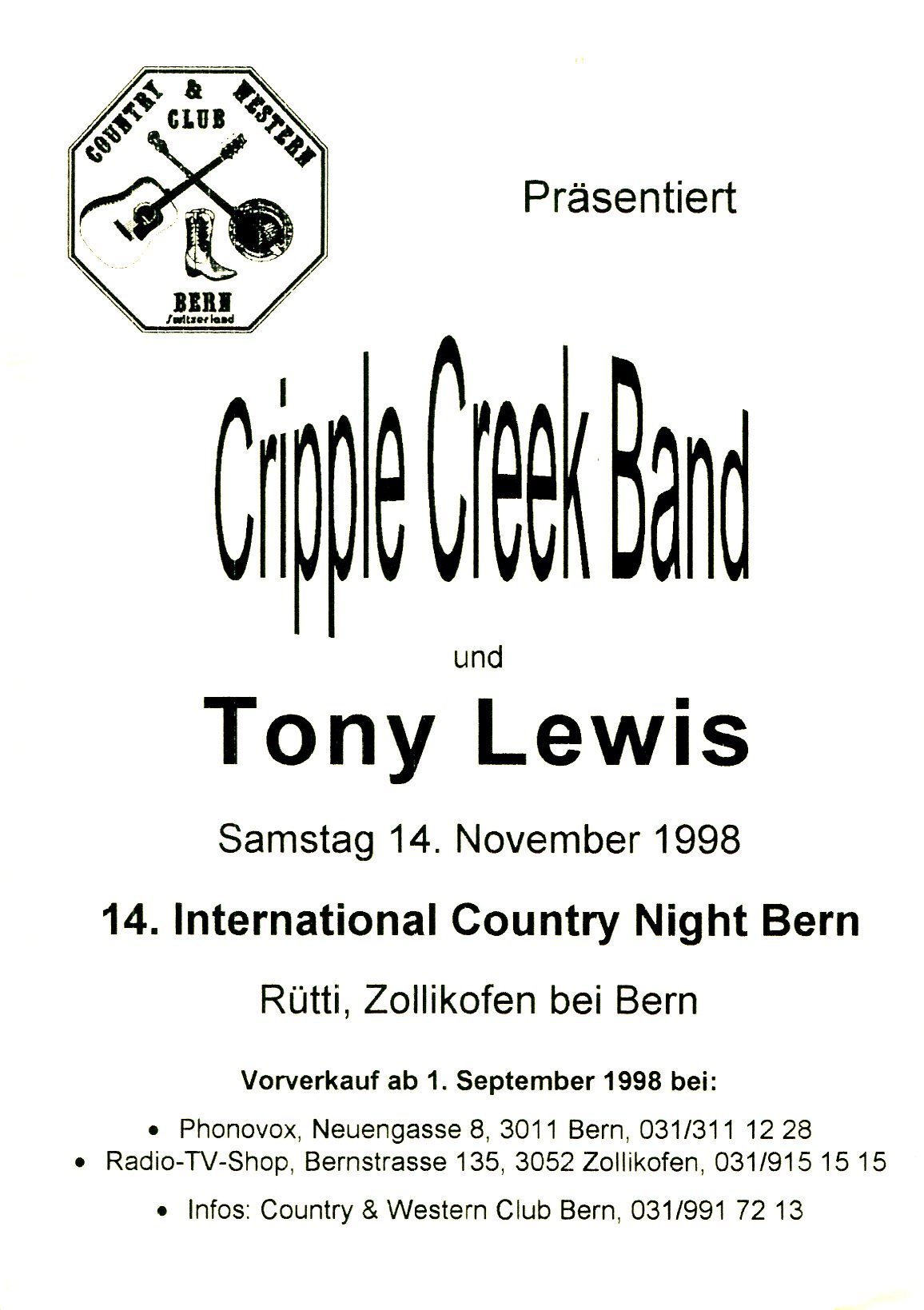 Tony Lewis / Cripple Creek Band Eintritt: Fr. 26.00 |