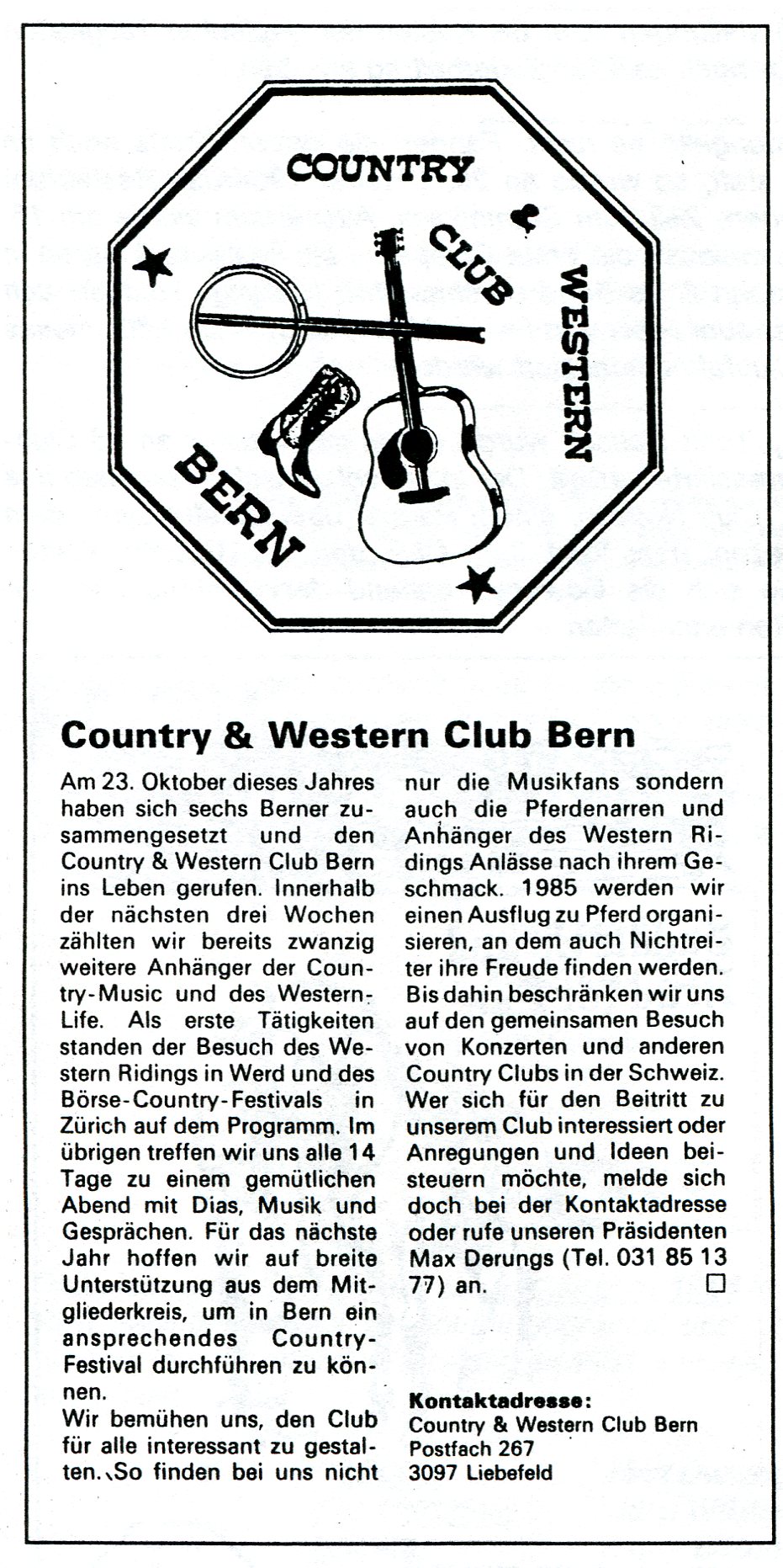 Dann war es endlich soweit, am 23. August 1984 konnte der Country & Western Club Bern auf der Terrasse des Gasthof Schönbühl gegründet werden. Mit den Mitgliedern, inzwischen auf sechs angewachsen, konnten der Vorstand vollständig besetzt werden. Der damalige Vorstand bestand aus: Präsident: Max Derungs Mangels konkreter Vorstellungen über die Kosten der geplanten Tätigkeiten wurde im ersten Vereinsjahr noch kein Mitgliederbeitrag erhoben. An Ideen und Illusionen mangelte es nicht. Fanden die ersten Treffs noch im Rest. Bürgerhaus in Bern statt, dann wurde ab 26. Oktober 1984 das Restaurant Sternen in Bümpliz für längere Zeit zum Stammlokal. Ausserdem wurde am 24. November eine Kutschenfahrt organisiert und am 15. Dezember der erste "Grossanlass", die erste Clubparty, im Restaurant Bären in Niederscherli mit Country John & his Band durchgeführt. Hungrige konnten sich ein üppiger Berner Teller zum Preis von Fr. 10.50 bestellen. Vom Erlös dieses Anlasses konnte nun die Clubfahne finanziert werden. Das erste Clubheft "Honky Tonk Notice" wurde im Oktober an 13 Clubmitglieder sowie an 19 Interessierte verteilt. |