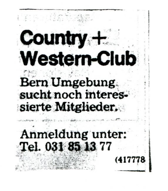 erkundigten wir uns sogleich beim Rodeo Horse in Bethlehem und wurden dort an Max Derungs verwiesen, der jedoch noch nicht so recht wusste, wie er die Gründung eines Clubs anpacken sollte. Nun beschlossen wir - inzwischen bereits zu dritt - Nägel mit Köpfen zu machen und die Gründung zu realisieren. Im Stadtanzeiger Bern suchten wir weitere Fans, wie nachfolgendes Inserat beweist.